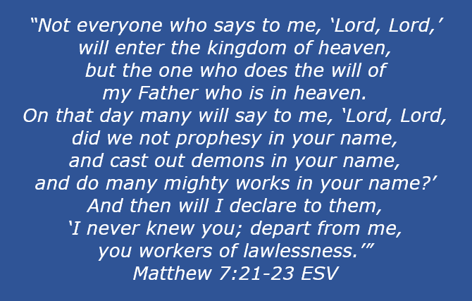 “Not everyone who says to me, ‘Lord, Lord,’ will enter the kingdom of heaven, but the one who does the will of my Father who is in heaven. On that day many will say to me, ‘Lord, Lord, did we not prophesy in your name, and cast out demons in your name, and do many mighty works in your name?’ And then will I declare to them, ‘I never knew you; depart from me, you workers of lawlessness.’”