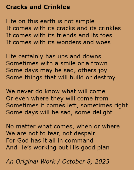 Cracks and Crinkles Image October 9, 2023 Sue Love Christian meme, poetryBible, Christian meme, Christianity, Encouragement, Faith, God, gospel, Inspirational, Jesus Christ, poetry, Salvation Share this: Click to share on X (Opens in new window) X Click to share on Facebook (Opens in new window) Facebook Click to print (Opens in new window) Print Click to email a link to a friend (Opens in new window) Email Like Loading... Related