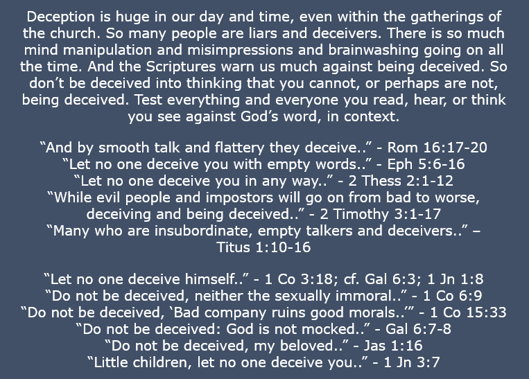 Deception is Huge Image December 1, 2023 Sue Love Christian memeBible, Christianity, deception, Encouragement, Faith, God, gospel, Inspirational, Jesus Christ, Salvation Share this: Share on X (Opens in new window) X Share on Facebook (Opens in new window) Facebook Print (Opens in new window) Print Email a link to a friend (Opens in new window) Email Like Loading... Related