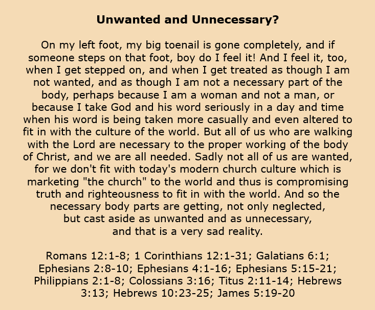 Unwanted and Unnecessary? Image January 27, 2024 Sue Love Christian memeBible, Christian meme, Christianity, Encouragement, Faith, God, gospel, Inspirational, Jesus Christ, Salvation Share this: Click to share on X (Opens in new window) X Click to share on Facebook (Opens in new window) Facebook Click to print (Opens in new window) Print Click to email a link to a friend (Opens in new window) Email Like Loading... Related
