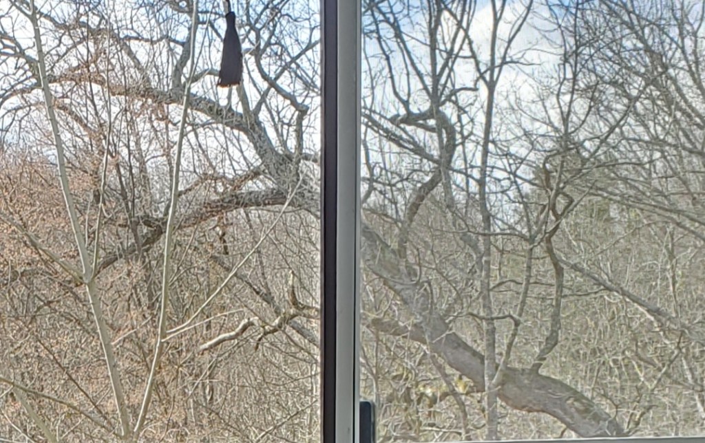 So, this morning I was sitting in the living room of mine and my husband’s apartment, and I was looking out our double glass sliding doors out to the woods behind us, when I saw in one of the trees the shape of a very large V, which is symbolic for victory. So, I took a picture of it, and then I discovered that on the other side was some tree limbs of another tree which were in the shape of a snake, and the snake was facing the direction of the V. We also have tassels which hang down from our short curtains above, and a tassel is usually a symbol of victory, too, as in graduation from school (learning), and the tassel appeared to be hanging from the very large V. Wow!