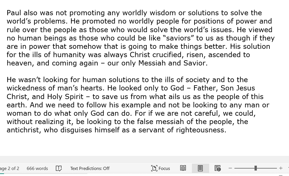 Paul also was not promoting any worldly wisdom or solutions to solve the world’s problems. He promoted no worldly people for positions of power and rule over the people as those who would solve the world’s issues. He viewed no human beings as those who could be like “saviors” to us as though if they are in power that somehow that is going to make things better. His solution for the ills of humanity was always Christ crucified, risen, ascended to heaven, and coming again – our only Messiah and Savior.