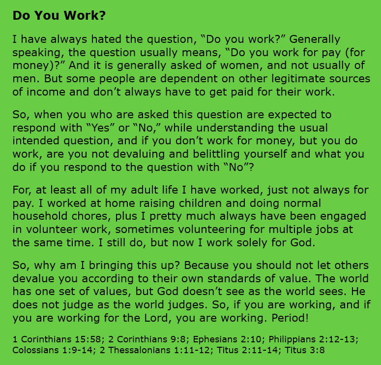 Do You Work? Image September 20, 2024 Sue Love Christian memeBible, Christian meme, Christianity, Encouragement, Faith, God, gospel, Inspirational, Jesus Christ, Salvation, work Share this: Click to share on X (Opens in new window) X Click to share on Facebook (Opens in new window) Facebook Click to print (Opens in new window) Print Click to email a link to a friend (Opens in new window) Email Like Loading... Related