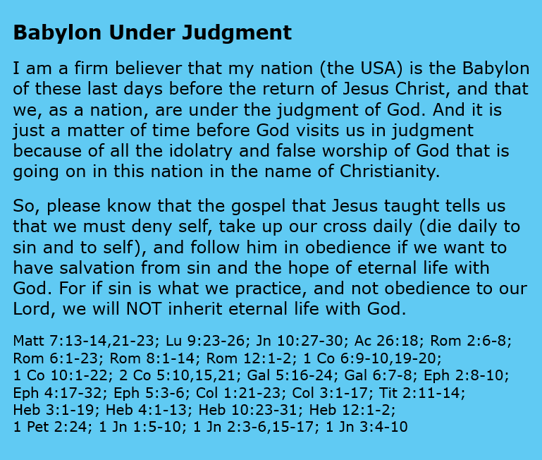 Babylon Under Judgment Image January 1, 2025 Sue Love Christian memeBabylon, Bible, Christian meme, Christianity, Encouragement, Faith, God, gospel, Inspirational, Jesus Christ, judgment of God, Salvation Share this: Share on X (Opens in new window) X Share on Facebook (Opens in new window) Facebook Print (Opens in new window) Print Email a link to a friend (Opens in new window) Email Like Loading... Related