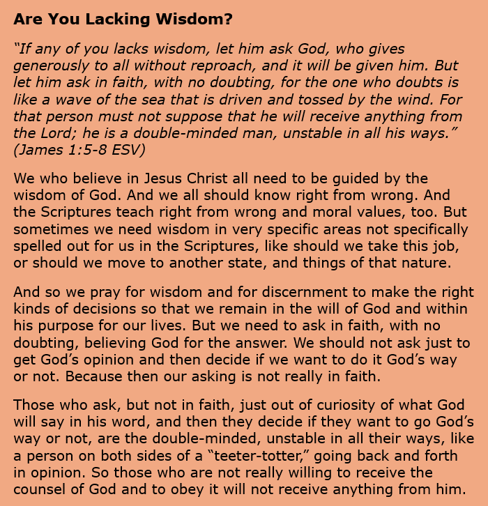 Are You Lacking Wisdom? Image January 7, 2025 Sue Love Christian memeBible, Christian meme, Christianity, Encouragement, Faith, God, gospel, Inspirational, Jesus Christ, Salvation, wisdom of God Share this: Click to share on X (Opens in new window) X Click to share on Facebook (Opens in new window) Facebook Click to print (Opens in new window) Print Click to email a link to a friend (Opens in new window) Email Like Loading... Related