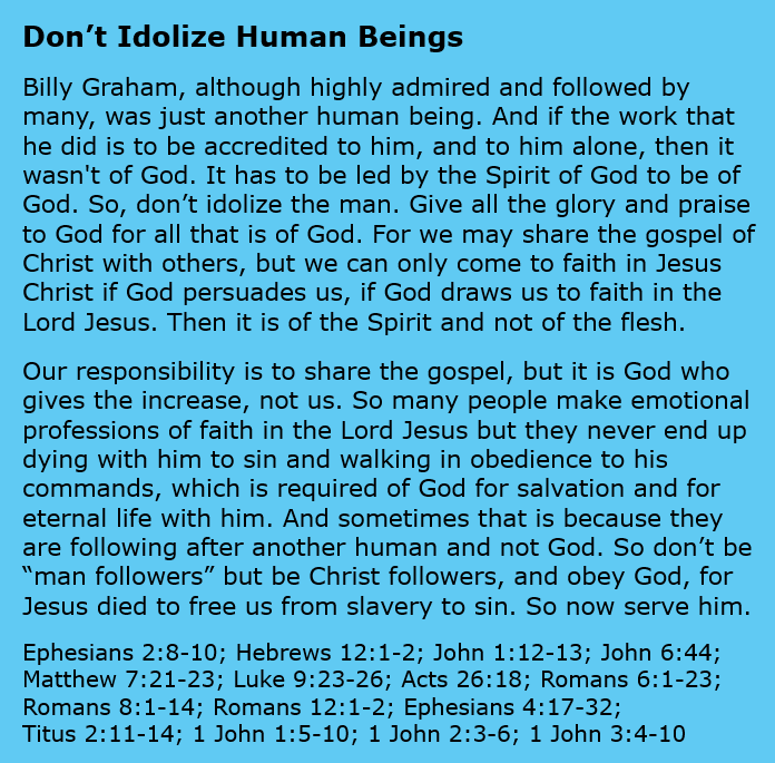 Don’t Idolize Human Beings Image January 10, 2025 Sue Love Christian memeBible, Christian meme, Christianity, Encouragement, Faith, God, gospel, human idols, Inspirational, Jesus Christ, Salvation Share this: Click to share on X (Opens in new window) X Click to share on Facebook (Opens in new window) Facebook Click to print (Opens in new window) Print Click to email a link to a friend (Opens in new window) Email Like Loading... Related