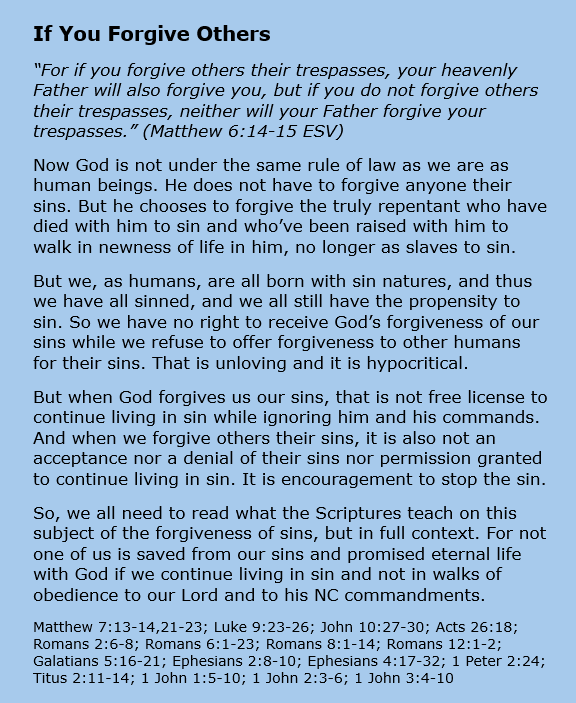 If You Forgive Others January 22, 2025 Sue Love Bible Studies, Christian meme, MatthewBible, Christianity, Encouragement, Faith, God, gospel, Inspirational, Jesus Christ, Salvation, Songs An Original Work / January 22, 2025Christ’s Free Servant, Sue J Love Share this: Click to share on X (Opens in new window) X Click to share on Facebook (Opens in new window) Facebook Click to print (Opens in new window) Print Click to email a link to a friend (Opens in new window) Email Like Loading... Related