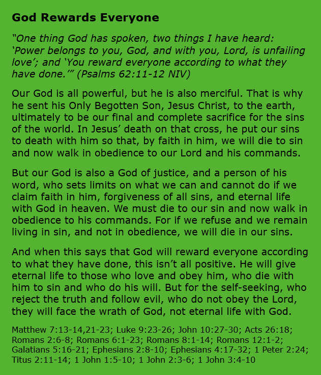 God Rewards Everyone February 3, 2025 Sue Love Bible Studies, Christian Devotional, Christian meme, PsalmsBible, Christian meme, Christianity, Encouragement, Faith, God, gospel, Inspirational, Jesus Christ, Salvation An Original Work / February 3, 2025Christ’s Free Servant, Sue J Love Share this: Share on X (Opens in new window) X Share on Facebook (Opens in new window) Facebook Print (Opens in new window) Print Email a link to a friend (Opens in new window) Email Like Loading... Related