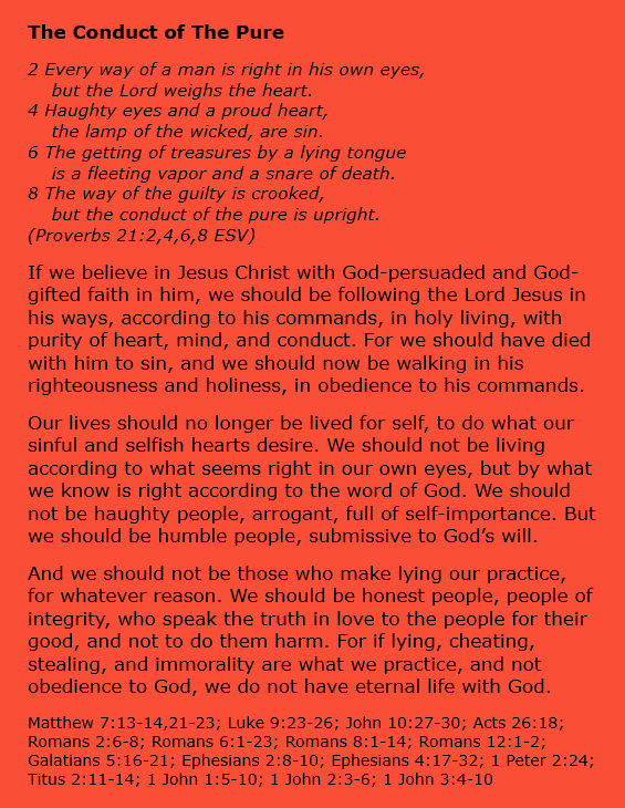 The Conduct of The Pure February 6, 2025 Sue Love Bible Studies, Christian Devotional, Christian meme, ProverbsBible, Christian meme, Christianity, Encouragement, Faith, God, gospel, Inspirational, Jesus Christ, Salvation An Original Work / February 6, 2025Christ’s Free Servant, Sue J Love Share this: Click to share on X (Opens in new window) X Click to share on Facebook (Opens in new window) Facebook Click to print (Opens in new window) Print Click to email a link to a friend (Opens in new window) Email Like Loading... Related