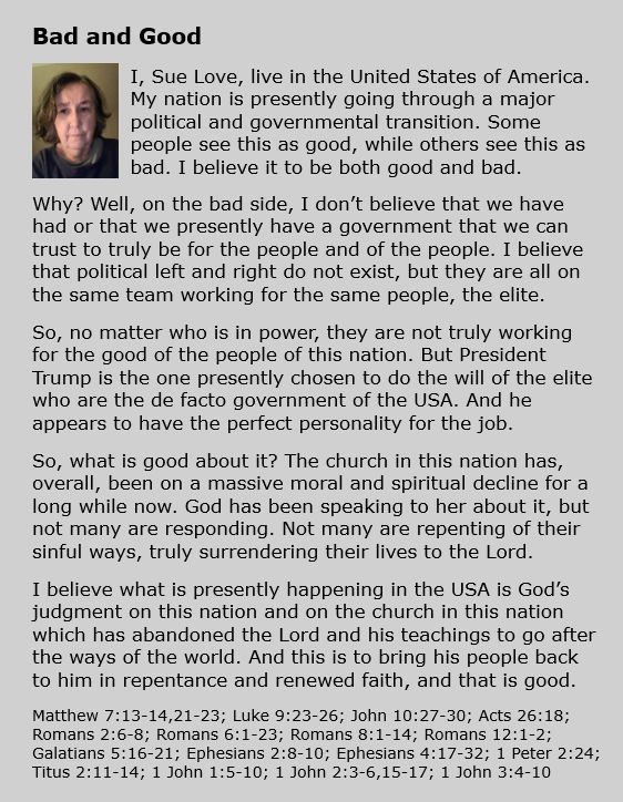 Bad and Good February 18, 2025 Sue Love Christian memeBible, Christianity, Encouragement, Faith, God, good & evil, government, Jesus Christ, judgment, politics An Original Work / February 18, 2025Christ’s Free Servant, Sue J Love Share this: Click to share on X (Opens in new window) X Click to share on Facebook (Opens in new window) Facebook Click to print (Opens in new window) Print Click to email a link to a friend (Opens in new window) Email Like Loading... Related