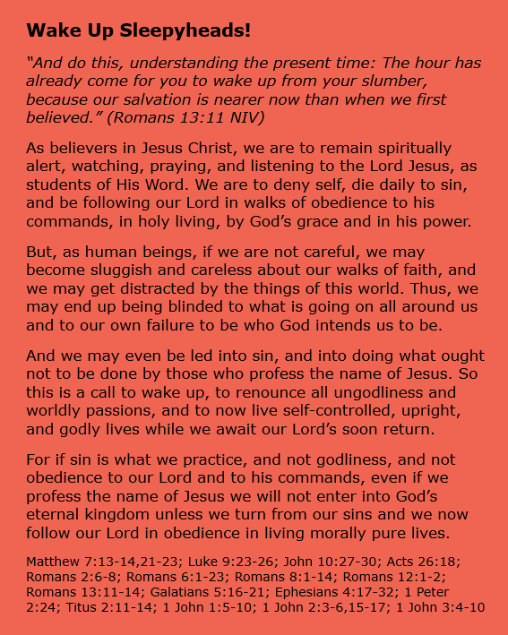 Wake Up Sleepyheads! February 21, 2025 Sue Love Bible Studies, Christian Devotional, Christian meme, RomansBible, Christian meme, Christianity, Encouragement, Faith, God, gospel, Inspirational, Jesus Christ, Salvation An Original Work / February 21, 2025Christ’s Free Servant, Sue J Love Share this: Click to share on X (Opens in new window) X Click to share on Facebook (Opens in new window) Facebook Click to print (Opens in new window) Print Click to email a link to a friend (Opens in new window) Email Like Loading... Related