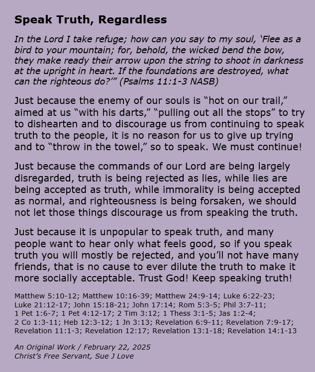 Speak Truth, Regardless Image February 22, 2025 Sue Love Bible Studies, Christian Devotional, Christian meme, PsalmsBible, Christianity, Encouragement, Faith, God, gospel, Inspirational, Jesus Christ, Salvation, Songs Share this: Click to share on X (Opens in new window) X Click to share on Facebook (Opens in new window) Facebook Click to print (Opens in new window) Print Click to email a link to a friend (Opens in new window) Email Like Loading... Related