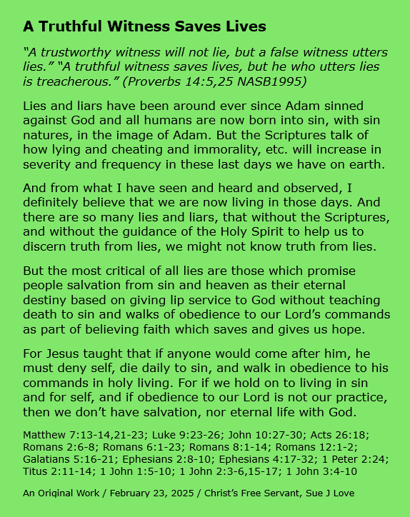A Truthful Witness Saves Lives Image February 23, 2025 Sue Love Bible Studies, Christian Devotional, Christian meme, ProverbsBible, Christian meme, Christianity, Encouragement, Faith, God, gospel, Inspirational, Jesus Christ, Salvation Share this: Click to share on X (Opens in new window) X Click to share on Facebook (Opens in new window) Facebook Click to print (Opens in new window) Print Click to email a link to a friend (Opens in new window) Email Like Loading... Related