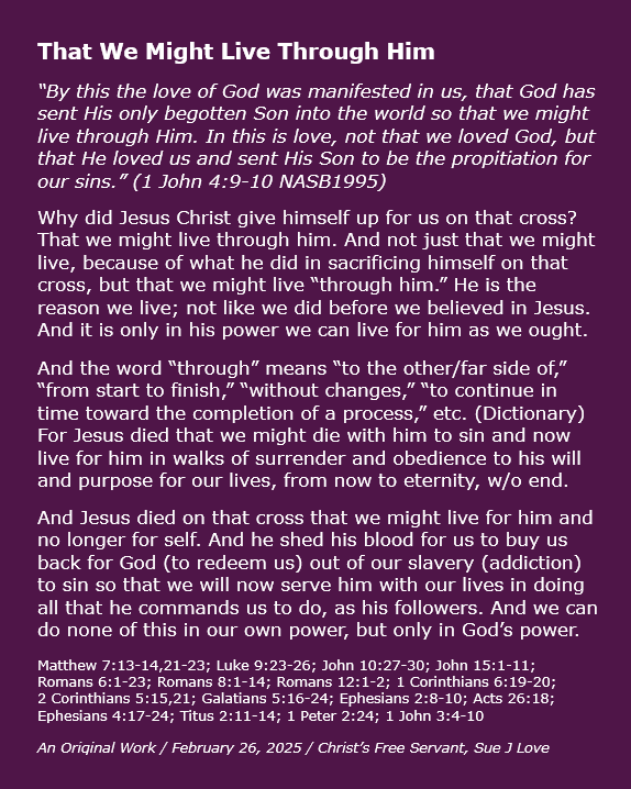That We Might Live Through Him Image February 26, 2025 Sue Love 1 John, Bible Studies, Christian Devotional, Christian memeBible, Christian meme, Christianity, Encouragement, Faith, God, gospel, Inspirational, Jesus Christ, Salvation Share this: Click to share on X (Opens in new window) X Click to share on Facebook (Opens in new window) Facebook Click to print (Opens in new window) Print Click to email a link to a friend (Opens in new window) Email Like Loading... Related