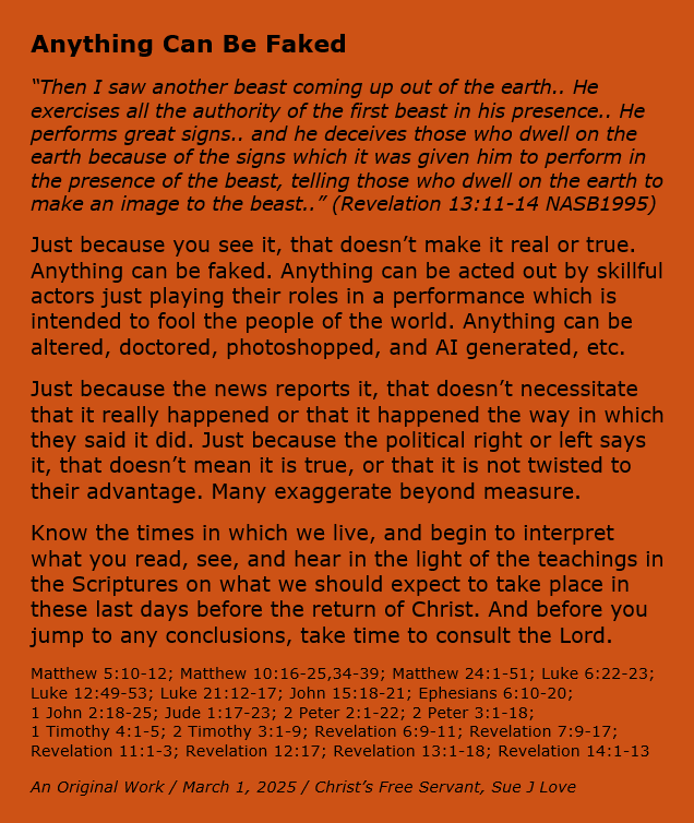 Anything Can Be Faked Image March 1, 2025 Sue Love Bible Studies, Christian Devotional, Christian meme, RevelationBible, Christian meme, Christianity, Encouragement, Faith, fakery, God, gospel, Inspirational, Jesus Christ, last days, Salvation Share this: Click to share on X (Opens in new window) X Click to share on Facebook (Opens in new window) Facebook Click to print (Opens in new window) Print Click to email a link to a friend (Opens in new window) Email Like Loading... Related