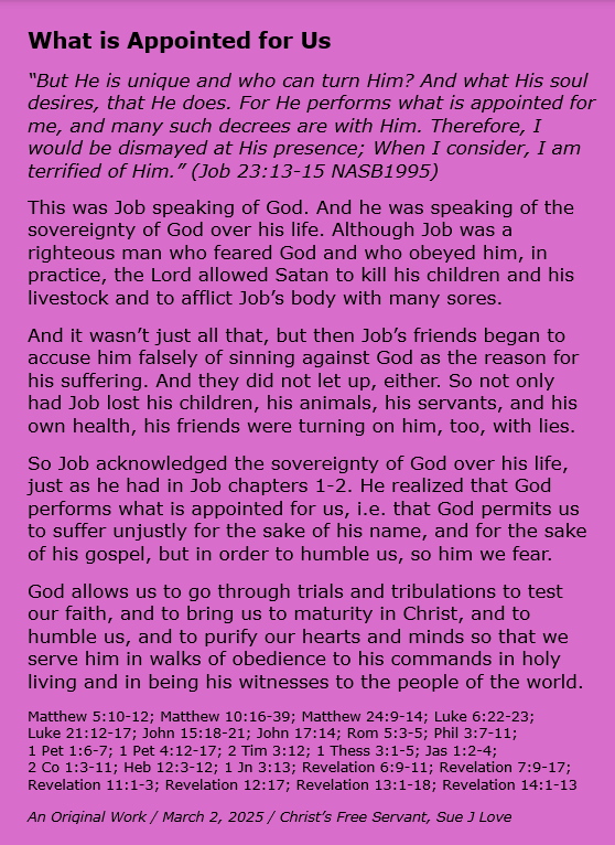 What is Appointed for Us Image March 2, 2025 Sue Love Bible Studies, Christian Devotional, Christian meme, JobBible, Christian meme, Christianity, Encouragement, Faith, God, gospel, Inspirational, Jesus Christ, Salvation Share this: Click to share on X (Opens in new window) X Click to share on Facebook (Opens in new window) Facebook Click to print (Opens in new window) Print Click to email a link to a friend (Opens in new window) Email Like Loading... Related