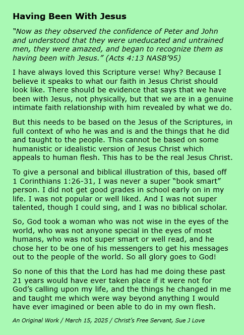 Having Been With Jesus Image March 15, 2025 Sue Love 1 Corinthians, Acts, Bible Studies, Christian Devotional, Christian memeBible, Christian meme, Christianity, Encouragement, Faith, God, gospel, Inspirational, Jesus Christ, Salvation, testimony Share this: Click to share on X (Opens in new window) X Click to share on Facebook (Opens in new window) Facebook Click to print (Opens in new window) Print Click to email a link to a friend (Opens in new window) Email Like Loading... Related