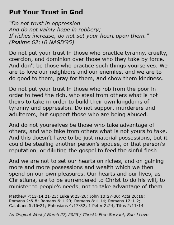 Put Your Trust in God Image March 27, 2025 Sue Love Bible Studies, Christian Devotional, Christian meme, PsalmsBible, Christianity, Encouragement, Faith, God, gospel, Inspirational, Jesus Christ, Salvation, Songs Share this: Click to share on X (Opens in new window) X Click to share on Facebook (Opens in new window) Facebook Click to print (Opens in new window) Print Click to email a link to a friend (Opens in new window) Email Like Loading... Related