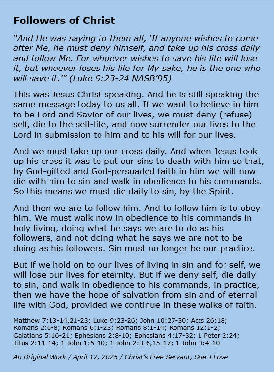 Followers of Christ Image April 12, 2025 Sue Love Bible Studies, Christian Devotional, Christian meme, LukeBible, Christianity, Encouragement, Faith, God, gospel, Inspirational, Jesus Christ, Salvation, Songs Share this: Click to share on X (Opens in new window) X Click to share on Facebook (Opens in new window) Facebook Click to print (Opens in new window) Print Click to email a link to a friend (Opens in new window) Email Like Loading... Related
