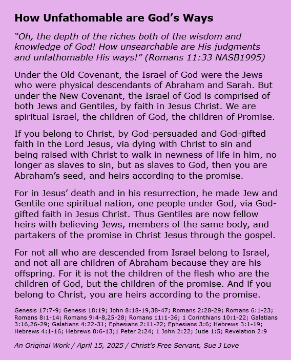 How Unfathomable are God’s Ways Image April 15, 2025 Sue Love Bible Studies, Christian Devotional, Christian meme, RomansBible, Christian meme, Christianity, Encouragement, Faith, God, gospel, Inspirational, Jesus Christ, Salvation Share this: Click to share on X (Opens in new window) X Click to share on Facebook (Opens in new window) Facebook Click to print (Opens in new window) Print Click to email a link to a friend (Opens in new window) Email Like Loading... Related