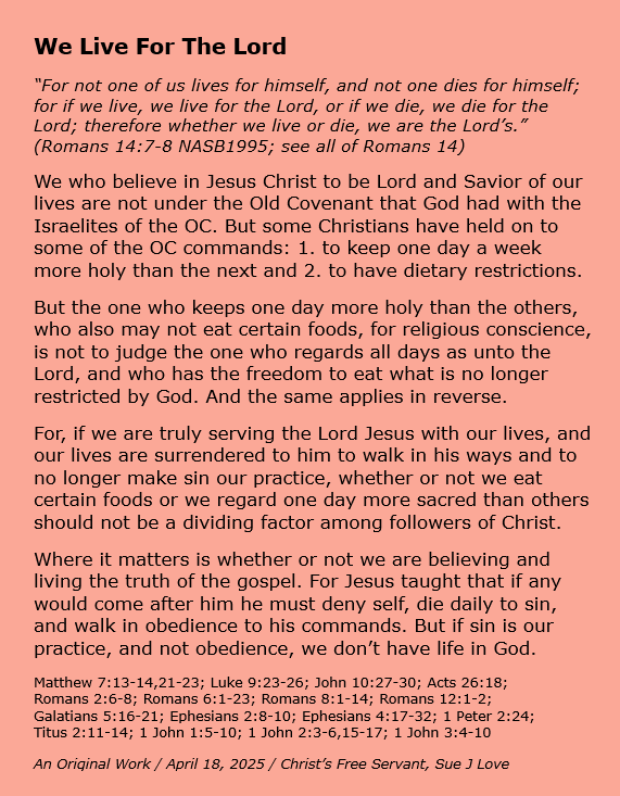 We Live For The Lord Image April 18, 2025 Sue Love Bible Studies, Christian Devotional, Christian meme, RomansBible, Christianity, Encouragement, Faith, God, gospel, Inspirational, Jesus Christ, Salvation, Songs Share this: Click to share on X (Opens in new window) X Click to share on Facebook (Opens in new window) Facebook Click to print (Opens in new window) Print Click to email a link to a friend (Opens in new window) Email Like Loading... Related