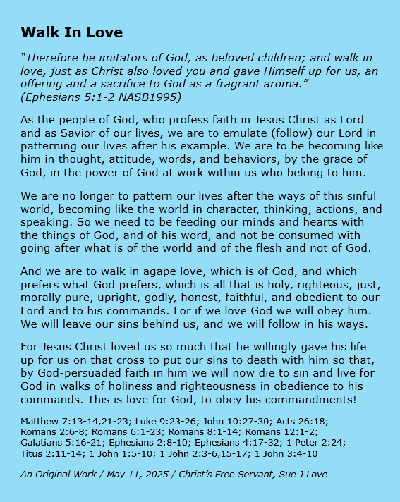 Walk In Love Image May 11, 2025 Sue Love Bible Studies, Christian Devotional, Christian meme, EphesiansBible, Christian meme, Christianity, Encouragement, Faith, God, gospel, Inspirational, Jesus Christ, Salvation Share this: Click to share on X (Opens in new window) X Click to share on Facebook (Opens in new window) Facebook Click to print (Opens in new window) Print Click to email a link to a friend (Opens in new window) Email Like Loading... Related