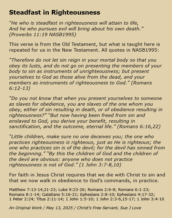 Steadfast in Righteousness Image May 13, 2025 Sue Love Bible Studies, Christian Devotional, Christian meme, ProverbsBible, Christianity, Encouragement, Faith, God, gospel, Inspirational, Jesus Christ, Salvation, Songs Share this: Click to share on X (Opens in new window) X Click to share on Facebook (Opens in new window) Facebook Click to print (Opens in new window) Print Click to email a link to a friend (Opens in new window) Email Like Loading... Related