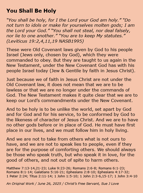 You Shall Be Holy Image June 26, 2025 Sue Love Bible Studies, Christian Devotional, Christian memeBible, Christian meme, Christianity, Encouragement, Faith, God, gospel, Inspirational, Jesus Christ, Salvation Share this: Click to share on X (Opens in new window) X Click to share on Facebook (Opens in new window) Facebook Click to print (Opens in new window) Print Click to email a link to a friend (Opens in new window) Email Like Loading... Related