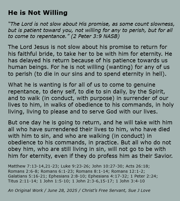 He is Not Willing Image June 28, 2025 Sue Love 2 Peter, Bible Studies, Christian Devotional, Christian memeBible, Christianity, Encouragement, Faith, God, gospel, Inspirational, Jesus Christ, Salvation, Songs Share this: Click to share on X (Opens in new window) X Click to share on Facebook (Opens in new window) Facebook Click to print (Opens in new window) Print Click to email a link to a friend (Opens in new window) Email Like Loading... Related