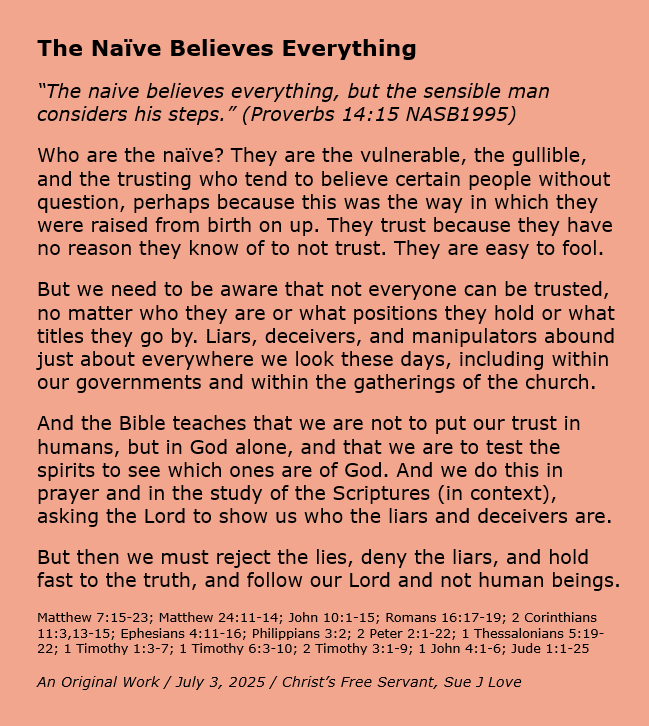 The Naïve Believes Everything Image July 3, 2025 Sue Love Bible Studies, Christian Devotional, Christian meme, ProverbsBible, Christian meme, Christianity, don't trust in humans, Encouragement, Faith, God, gospel, Inspirational, Jesus Christ, Salvation, the naive Share this: Click to share on X (Opens in new window) X Click to share on Facebook (Opens in new window) Facebook Click to print (Opens in new window) Print Click to email a link to a friend (Opens in new window) Email Like Loading... Related