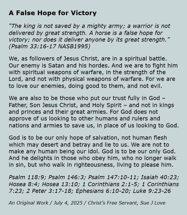 A False Hope for Victory Image July 4, 2025 Sue Love Bible Studies, Christian Devotional, Christian meme, PsalmsBible, Christian meme, Christianity, Encouragement, Faith, God, gospel, Inspirational, Jesus Christ, Salvation Share this: Click to share on X (Opens in new window) X Click to share on Facebook (Opens in new window) Facebook Click to print (Opens in new window) Print Click to email a link to a friend (Opens in new window) Email Like Loading... Related