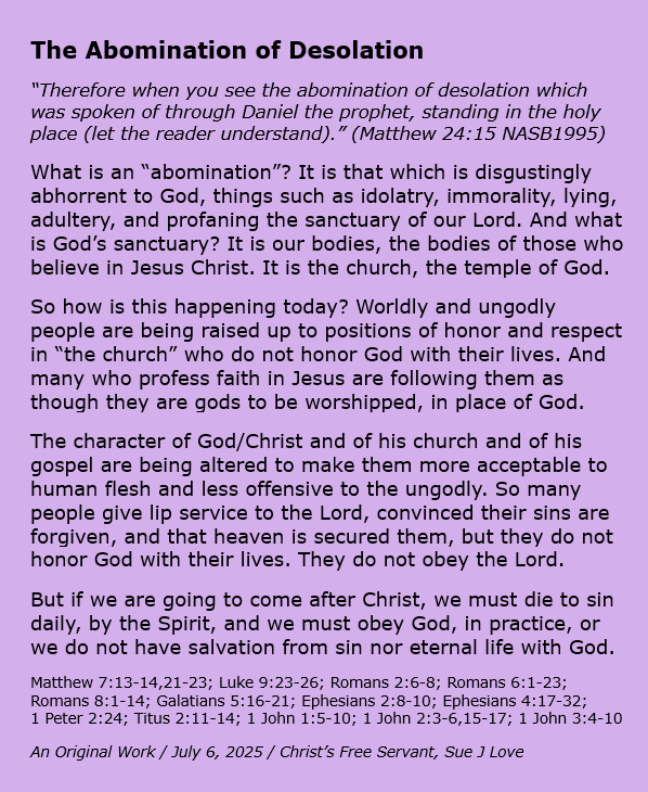 The Abomination of Desolation Image July 6, 2025 Sue Love Bible Studies, Christian Devotional, Christian meme, MatthewBible, Christianity, Encouragement, Faith, God, gospel, Inspirational, Jesus Christ, Salvation, Songs Share this: Click to share on X (Opens in new window) X Click to share on Facebook (Opens in new window) Facebook Click to print (Opens in new window) Print Click to email a link to a friend (Opens in new window) Email Like Loading... Related