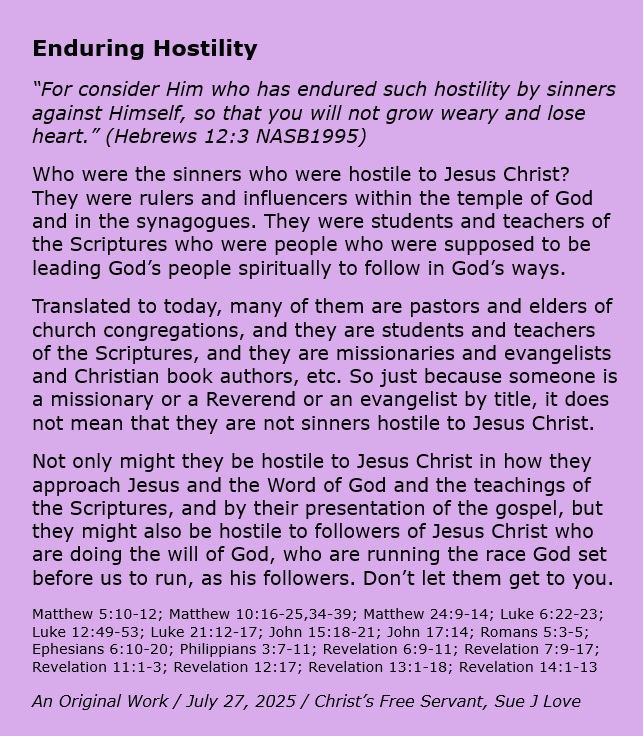 Enduring Hostility Image July 27, 2025 Sue Love Bible Studies, Christian Devotional, Christian meme, HebrewsBible, Christian meme, Christianity, Encouragement, Faith, God, gospel, hostility, Inspirational, Jesus Christ, Salvation Share this: Click to share on X (Opens in new window) X Click to share on Facebook (Opens in new window) Facebook Click to print (Opens in new window) Print Click to email a link to a friend (Opens in new window) Email Like Loading... Related