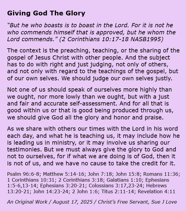 Giving God The Glory Image August 17, 2025 Sue Love 2 Corinthians, Bible Studies, Christian Devotional, Christian memeBible, Christian meme, Christianity, Encouragement, Faith, God, gospel, Inspirational, Jesus Christ, Salvation Share this: Click to share on X (Opens in new window) X Click to share on Facebook (Opens in new window) Facebook Click to print (Opens in new window) Print Click to email a link to a friend (Opens in new window) Email Like Loading... Related