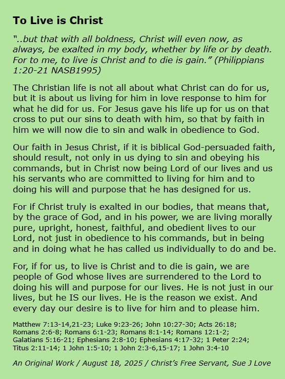 To Live is Christ Image August 18, 2025 Sue Love Bible Studies, Christian Devotional, Christian meme, PhilippiansBible, Christian meme, Christianity, Encouragement, Faith, God, gospel, Inspirational, Jesus Christ, Salvation Share this: Click to share on X (Opens in new window) X Click to share on Facebook (Opens in new window) Facebook Click to print (Opens in new window) Print Click to email a link to a friend (Opens in new window) Email Like Loading... Related