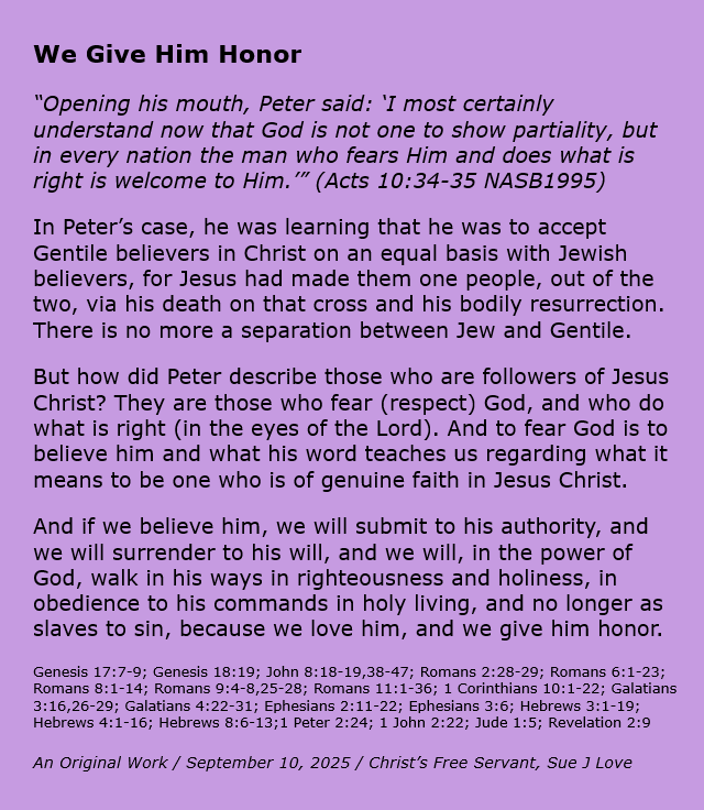 We Give Him Honor Image September 10, 2025 Sue Love Acts, Christian Devotional, Christian memeBible, Christian meme, Christianity, Encouragement, Faith, God, gospel, Inspirational, Jesus Christ, Salvation Share this: Click to share on X (Opens in new window) X Click to share on Facebook (Opens in new window) Facebook Click to print (Opens in new window) Print Click to email a link to a friend (Opens in new window) Email Like Loading... Related