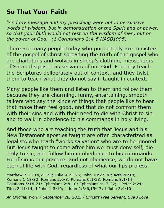 So That Your Faith Image September 28, 2025 Sue Love 1 Corinthians, Bible Studies, Christian Devotional, Christian memeBible, Christian meme, Christianity, Encouragement, Faith, God, gospel, Inspirational, Jesus Christ, Salvation Share this: Click to share on X (Opens in new window) X Click to share on Facebook (Opens in new window) Facebook Click to print (Opens in new window) Print Click to email a link to a friend (Opens in new window) Email Like Loading... Related