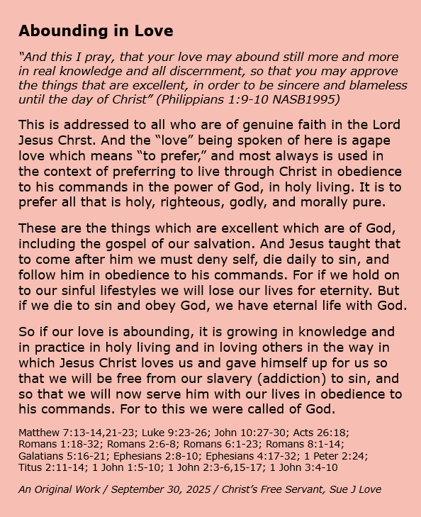 Abounding in Love Image September 30, 2025 Sue Love Bible Studies, Christian Devotional, PhilippiansBible, Christian meme, Christianity, Encouragement, Faith, God, gospel, Inspirational, Jesus Christ, Salvation Share this: Click to share on X (Opens in new window) X Click to share on Facebook (Opens in new window) Facebook Click to print (Opens in new window) Print Click to email a link to a friend (Opens in new window) Email Like Loading... Related