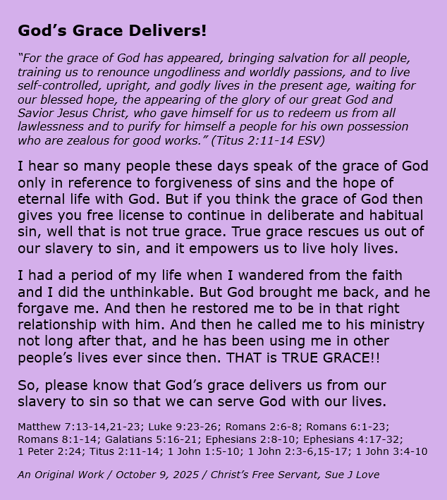 God’s Grace Delivers Image October 9, 2025 Sue Love Bible Studies, Christian Devotional, Christian meme, TitusBible, Christianity, Encouragement, Faith, God, gospel, Inspirational, Jesus Christ, Salvation, Songs Share this: Click to share on X (Opens in new window) X Click to share on Facebook (Opens in new window) Facebook Click to print (Opens in new window) Print Click to email a link to a friend (Opens in new window) Email Like Loading... Related