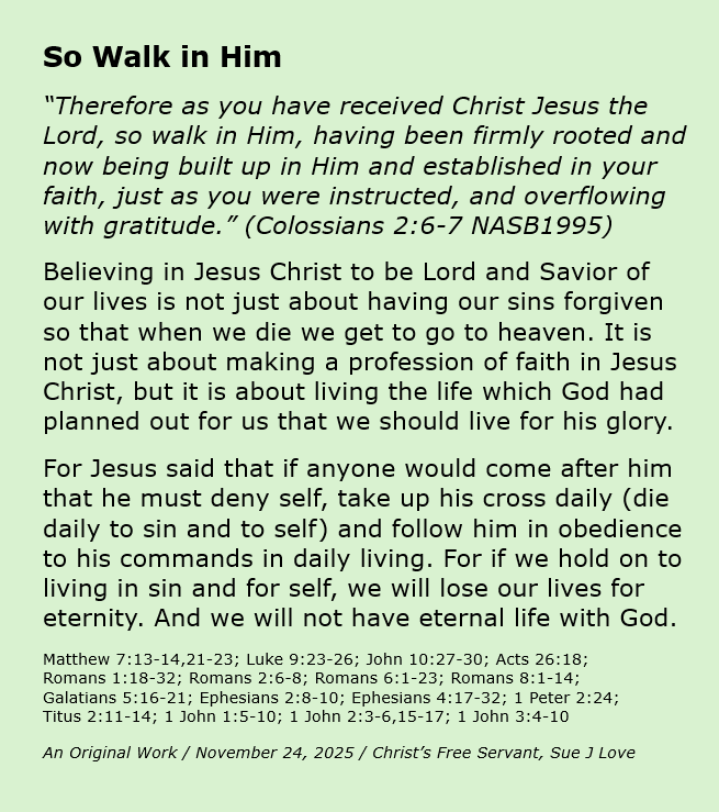 So Walk in Him Image November 24, 2025 Sue Love Bible Studies, Christian Devotional, Christian meme, ColossiansBible, Christian meme, Christianity, Encouragement, Faith, God, gospel, Inspirational, Jesus Christ, Salvation Share this: Click to share on X (Opens in new window) X Click to share on Facebook (Opens in new window) Facebook Click to print (Opens in new window) Print Click to email a link to a friend (Opens in new window) Email Like Loading... Related
