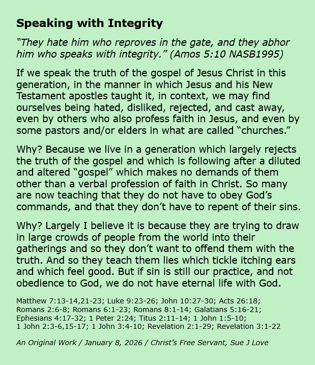 Speaking with Integrity Image January 8, 2026 Sue Love Amos, Bible Studies, Christian Devotional, Christian memeBible, Christian meme, Christianity, Encouragement, Faith, God, gospel, Inspirational, integrity, Jesus Christ, Salvation Share this: Share on X (Opens in new window) X Share on Facebook (Opens in new window) Facebook Print (Opens in new window) Print Email a link to a friend (Opens in new window) Email Like Loading... Related