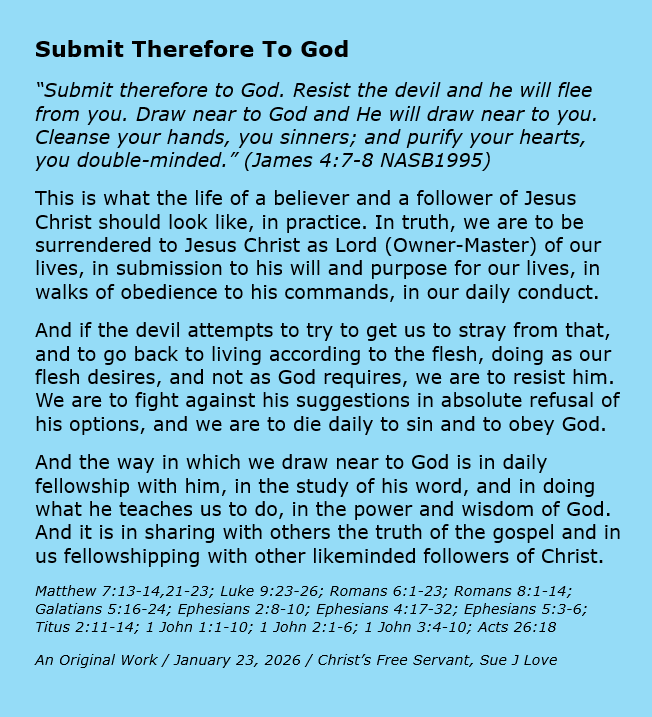 Submit Therefore To God Image January 23, 2026 Sue Love Bible Studies, Christian Devotional, Christian meme, JamesBible, Christianity, Encouragement, Faith, God, gospel, Inspirational, Jesus Christ, Salvation, Songs Share this: Share on X (Opens in new window) X Share on Facebook (Opens in new window) Facebook Print (Opens in new window) Print Email a link to a friend (Opens in new window) Email Like Loading... Related