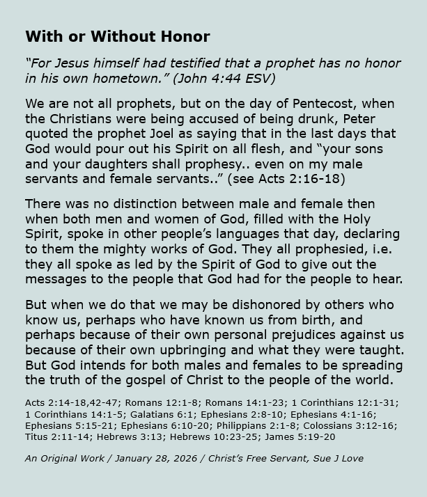 With or Without Honor Image January 28, 2026 Sue Love Christian Devotional, Christian meme, Bible Studies, JohnBible, Christian meme, Christianity, Encouragement, Faith, God, gospel, Inspirational, Jesus Christ, Salvation Share this: Share on X (Opens in new window) X Share on Facebook (Opens in new window) Facebook Print (Opens in new window) Print Email a link to a friend (Opens in new window) Email Like Loading... Related