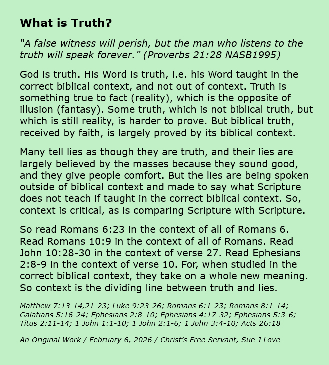 What is Truth? Image February 6, 2026 Sue Love Bible Studies, Christian Devotional, Christian meme, ProverbsBible, Christian meme, Christianity, Encouragement, Faith, God, gospel, Inspirational, Jesus Christ, Salvation Share this: Share on X (Opens in new window) X Share on Facebook (Opens in new window) Facebook Print (Opens in new window) Print Email a link to a friend (Opens in new window) Email Like Loading... Related