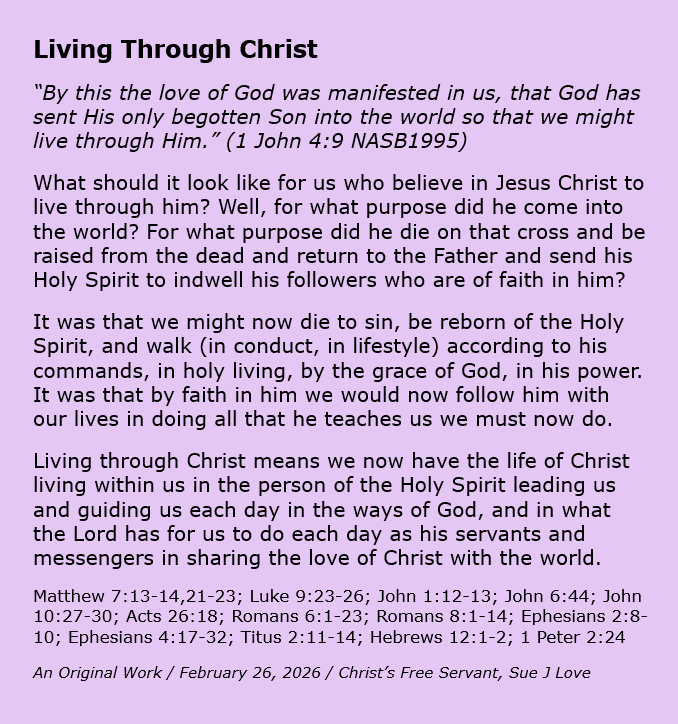Living Through Christ Image February 26, 2026 Sue Love 1 John, Bible Studies, Christian Devotional, Christian memeBible, Christian meme, Christianity, Encouragement, Faith, God, gospel, Inspirational, Jesus Christ, Salvation Share this: Share on X (Opens in new window) X Share on Facebook (Opens in new window) Facebook Print (Opens in new window) Print Email a link to a friend (Opens in new window) Email Like Loading... Related
