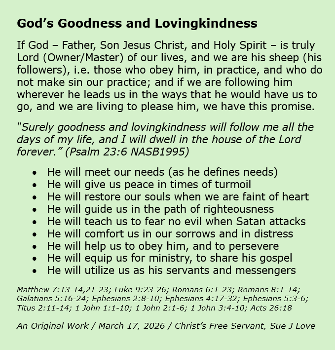 God’s Goodness and Lovingkindness Image March 17, 2026 Sue Love Bible Studies, Christian Devotional, Christian meme, PsalmsBible, Christian meme, Christianity, Encouragement, Faith, God, gospel, Inspirational, Jesus Christ, Salvation Share this: Share on X (Opens in new window) X Share on Facebook (Opens in new window) Facebook Print (Opens in new window) Print Email a link to a friend (Opens in new window) Email Like Loading... Related