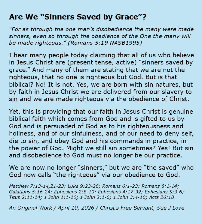 Are We “Sinners Saved By Grace”? Image April 10, 2026 Sue Love Bible Studies, Christian Devotional, Christian meme, RomansBible, Christian meme, Christianity, Encouragement, Faith, God, gospel, Inspirational, Jesus Christ, Salvation Share this: Share on X (Opens in new window) X Share on Facebook (Opens in new window) Facebook Print (Opens in new window) Print Email a link to a friend (Opens in new window) Email Like Loading... Related